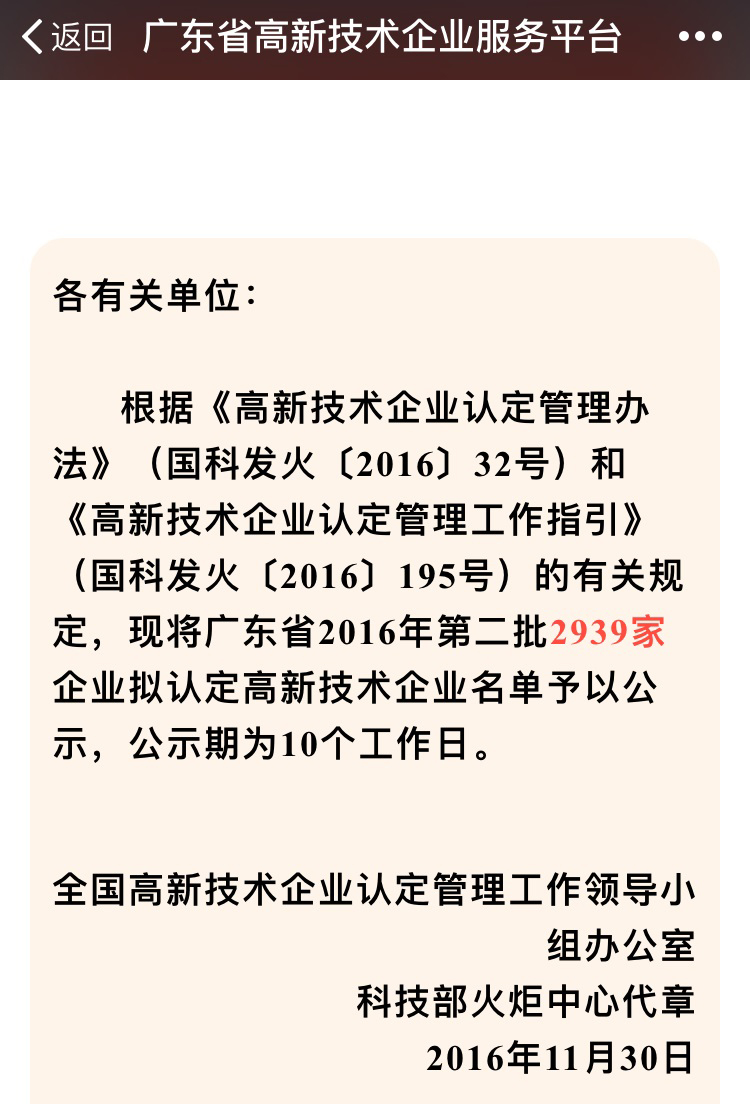 11月30日,全國高新技術(shù)企業(yè)認(rèn)定管理工作領(lǐng)導(dǎo)小組辦公室公布了2016年廣東省第二批擬認(rèn)定國家高新技術(shù)企業(yè)名單,共2939家企業(yè)通過國家高新技術(shù)企業(yè)認(rèn)定。科園榜上有名,榮獲國家高新技術(shù)企業(yè),這是對我司的高度認(rèn)可,更堅(jiān)定了我們自主研發(fā)、自主創(chuàng)新,堅(jiān)持中國創(chuàng)造的產(chǎn)業(yè)決心!