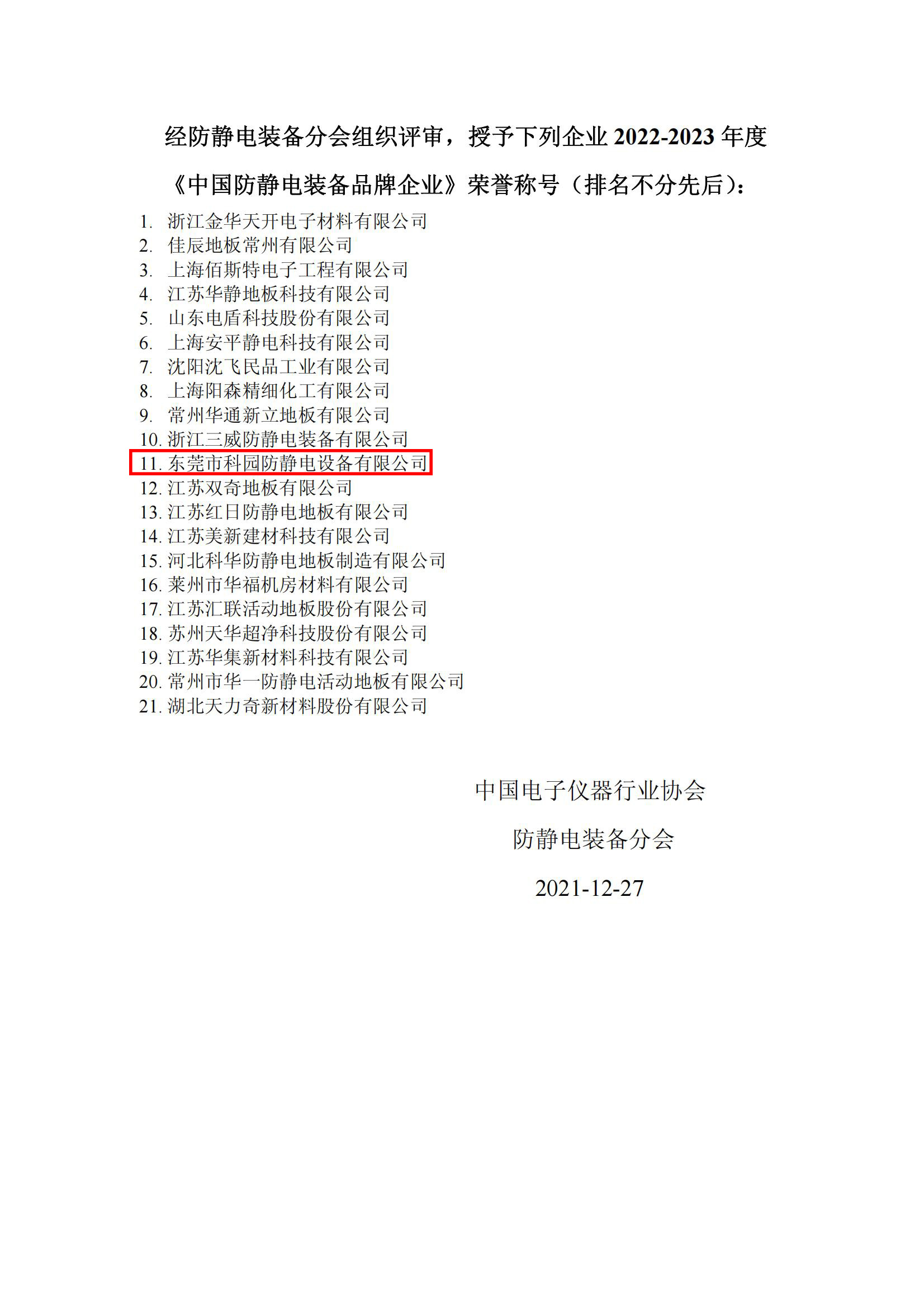 12月27日,東莞市科園防靜電設(shè)備有限公司(卡帕爾國(guó)際)生產(chǎn)的除靜電設(shè)備,得到中國(guó)電子儀器行業(yè)協(xié)會(huì) 防靜電裝備分會(huì)高度肯定,經(jīng)防靜電裝備分會(huì)組織評(píng)審,授予2022-2023 年度 《中國(guó)防靜電裝備品牌企業(yè)》榮譽(yù)稱(chēng)號(hào),華南地區(qū)唯一獲獎(jiǎng)企業(yè)!