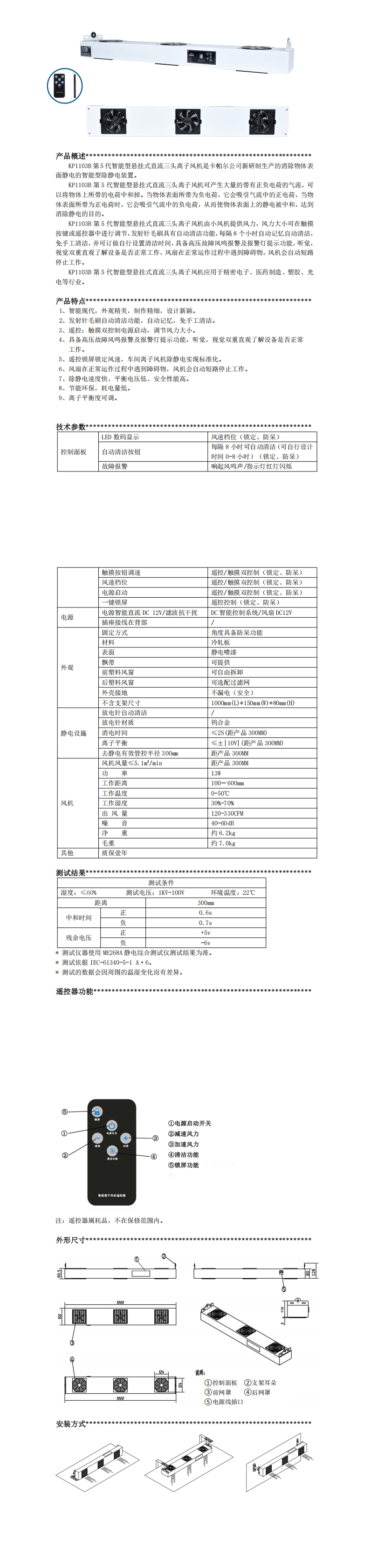 KP1103B 第 5 代智能型懸掛式直流三頭離子風(fēng)機(jī)