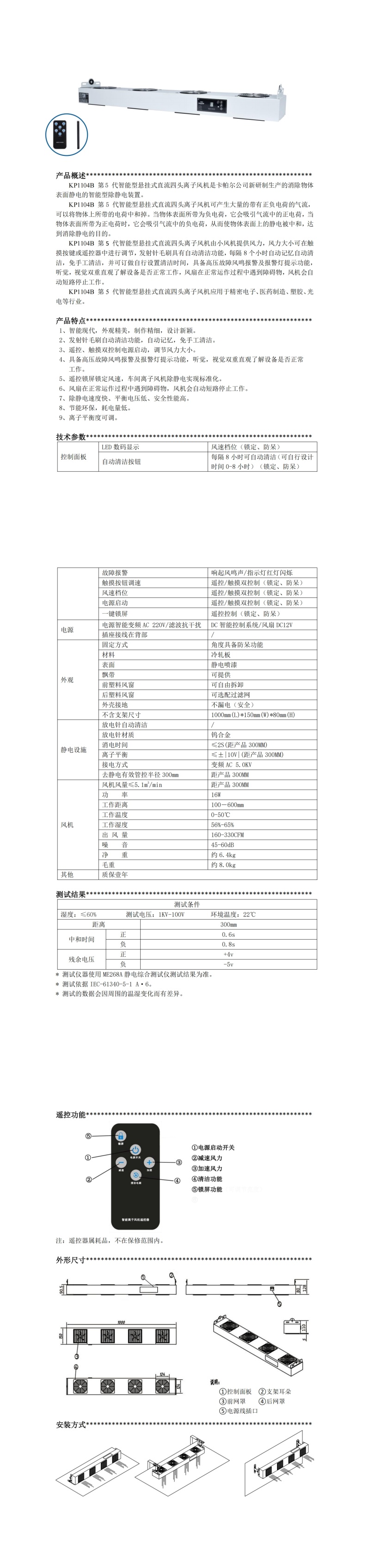 KP1104B 第 5 代智能型懸掛式直流四頭離子風(fēng)機(jī)